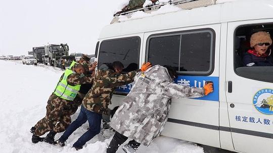 圖為官兵幫助被困車輛安全脫困。