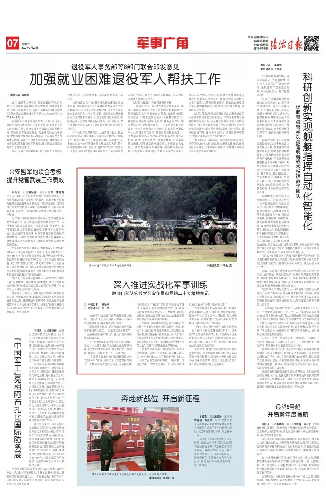 “駐軍要發(fā)揮維護(hù)澳門長(zhǎng)期繁榮穩(wěn)定的‘定海神針’作用,必須把學(xué)習(xí)宣傳貫徹黨的二十大精神作為首要政治任務(wù),全面提升履行防務(wù)能力?!瘪v澳門部隊(duì)作訓(xùn)處處長(zhǎng)李健說,新年以來,他們圍繞職能使命任務(wù),結(jié)合崗位戰(zhàn)位學(xué)習(xí)貫徹黨的二十大精神,緊扣實(shí)戰(zhàn)標(biāo)準(zhǔn),統(tǒng)籌戰(zhàn)備訓(xùn)練與應(yīng)急應(yīng)戰(zhàn),掀起全面推進(jìn)實(shí)戰(zhàn)化軍事訓(xùn)練的熱潮。