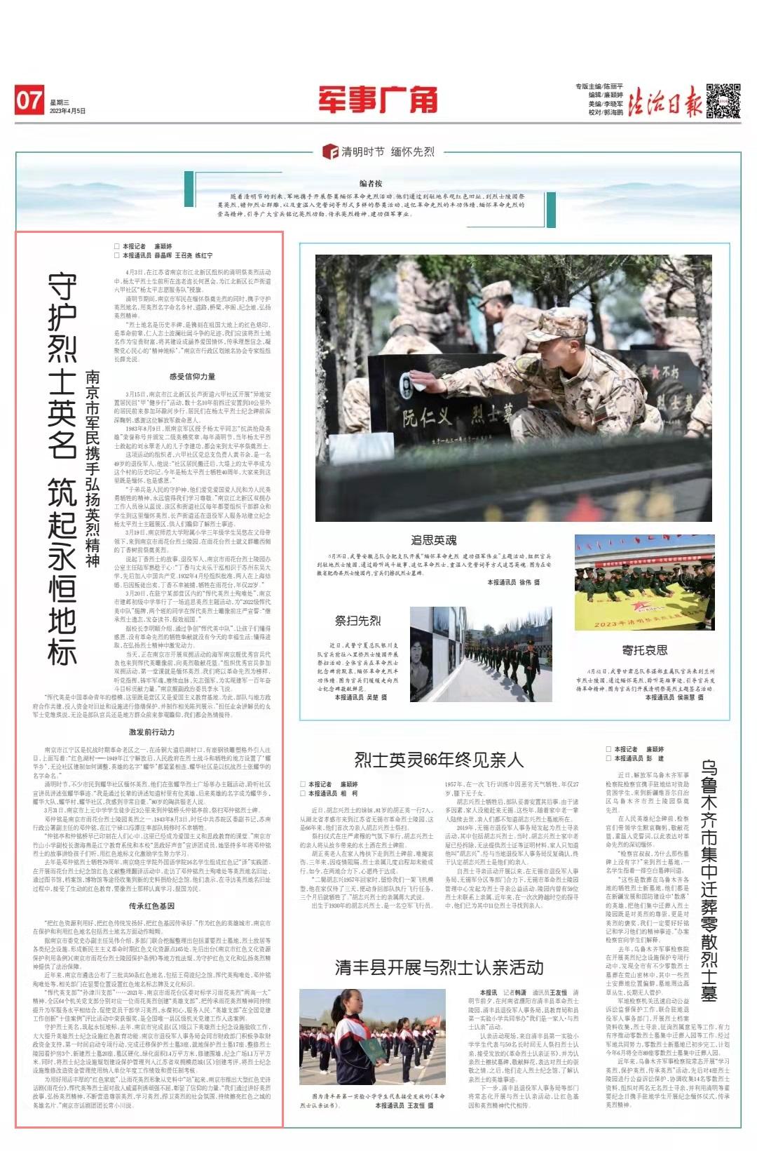清明節(jié)期間,南京市軍民在緬懷祭奠先烈的同時(shí),攜手守護(hù)英烈地名,用英烈名字命名鄉(xiāng)村、道路、橋梁、亭閣、紀(jì)念地,弘揚(yáng)英烈精神。