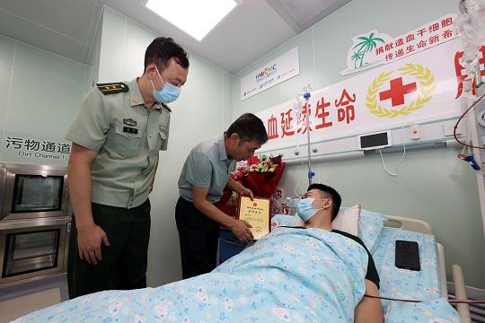 圖為海南省紅十字會和武警三亞支隊(duì)相關(guān)領(lǐng)導(dǎo)為文濤頒發(fā)榮譽(yù)證書。