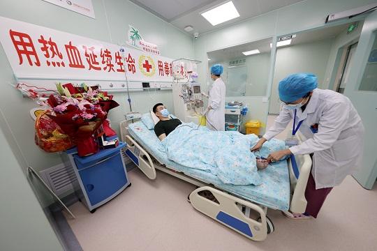 4月6日,海南省婦女兒童醫(yī)學(xué)中心采集室,血液順著針管,從武警海南總隊(duì)三亞支隊(duì)?wèi)?zhàn)士文濤(化名)的右臂流出,再通過血液分離機(jī)從右腳流回身體。此刻,文濤正靜靜地躺在病床上。