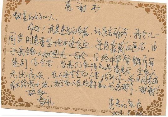 和200毫升造血干細(xì)胞混懸液一同送到患者身邊的,還有一封文濤寫的信,他希望小女孩早日恢復(fù)健康,擁有一顆溫暖的心和一個美好的未來。