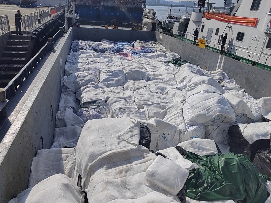 經(jīng)查,該嫌疑船為鐵質(zhì)運輸船,駕駛臺后方為貨艙,貨艙內(nèi)裝有白色和黑色塑料編織袋,袋內(nèi)有來源不明的牛肉、牛腩、牛肚、牛筋、驢雜等凍品約485噸,案值約4000萬元,隨船人員均未能提供船上所裝載貨物的相關(guān)合法來源證明,執(zhí)法員依法對該船舶和凍品進(jìn)行扣押。