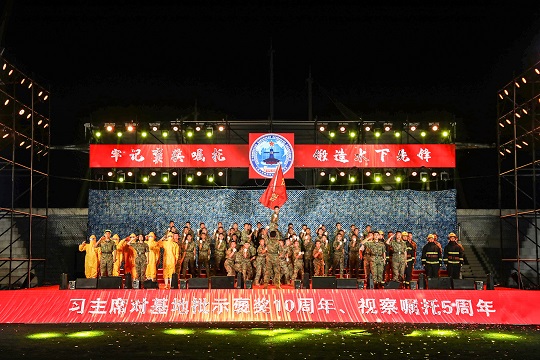 隨著音樂緩緩響起,來自援建單位湖北十八洞村八一愛民學(xué)校學(xué)生走上舞臺,與官兵齊聲合唱《不忘初心》。