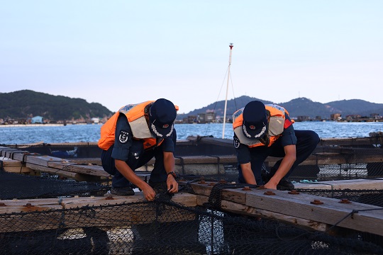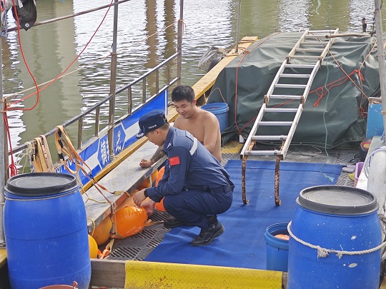 圖為幫助漁民做好加固纜繩,檢查船體設備。