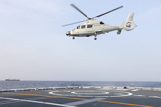 圖為當(dāng)?shù)貢r間7月26日下午,編隊指揮艦淄博艦艦載直升機起飛,遠處為航行中的“海瀾之韻”號商船。孫飛 攝