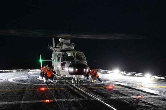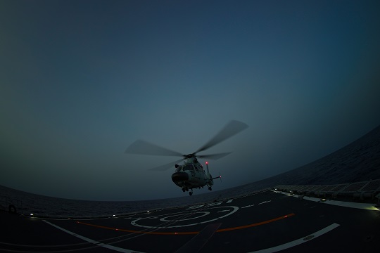 圖為當(dāng)?shù)貢r間7月26日晚上,編隊指揮艦淄博艦艦載直升機完成警戒巡邏后任務(wù)后進行夜間著艦。張元虎 攝