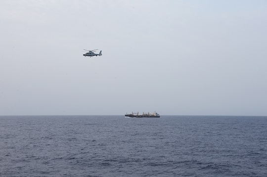 圖為當(dāng)?shù)貢r間7月26日下午,編隊指揮艦淄博艦艦載直升機正在“海瀾之韻”號商船附近??沼蚓溲策?。孫飛 攝