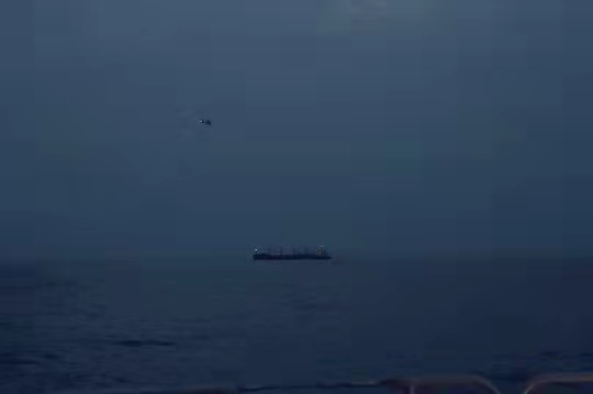 圖為當(dāng)?shù)貢r間7月26日晚上,編隊指揮艦淄博艦艦載直升機正在“海瀾之韻”號商船附近??沼蜻M行夜間警戒巡邏。孫飛 攝
