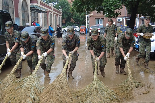 8月1日,北京市門頭溝區(qū)受連續(xù)暴雨和山洪影響,大量泥沙、草木堆積在河道兩側(cè)和市區(qū)道路,嚴重阻礙交通出行。中部戰(zhàn)區(qū)空軍某部組織官兵赴街道社區(qū),參與清除淤泥和垃圾20 余噸,積極配合駐地開展應(yīng)急支援和災(zāi)后秩序恢復工作。