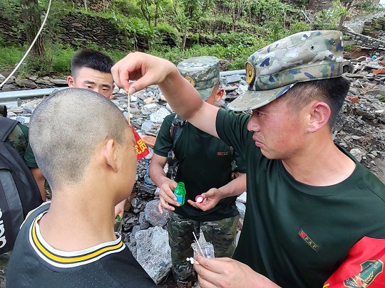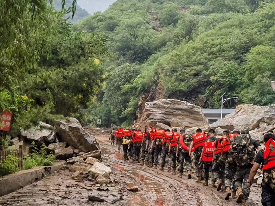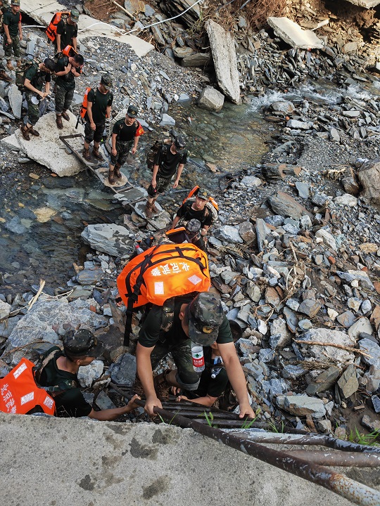 8月4日,由于道路被沖毀,北京市房山區(qū)史家營(yíng)鄉(xiāng)多個(gè)自然村斷水?dāng)嚯?,物資緊缺,武警北京總隊(duì)機(jī)動(dòng)第二支隊(duì)緊急出動(dòng)300余人,山區(qū)徒步40公里,人均負(fù)重30千克,將村民緊缺的食物,藥品,飲水送至村民手中,并轉(zhuǎn)運(yùn)重傷災(zāi)民、老人8人。