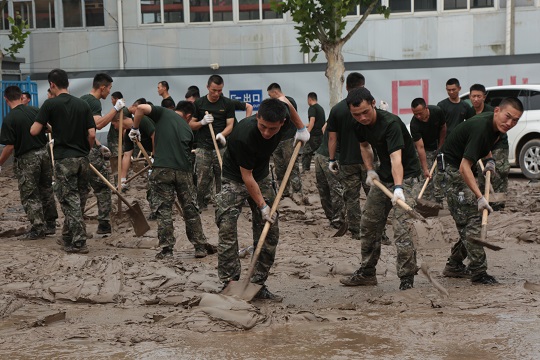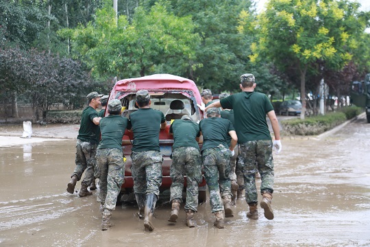 圖為武警河北總隊(duì)保定支隊(duì)官兵趕赴河北淶水受災(zāi)現(xiàn)場(chǎng)。