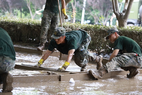 圖為武警河北總隊(duì)機(jī)動(dòng)支隊(duì)官兵在河北涿州市騰飛大街清理淤泥。江騰 攝