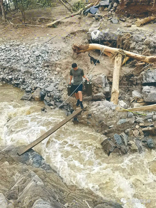 圖為某旅官兵攜帶裝備通過臨時搭建的簡易木板橋。唐琦智 攝