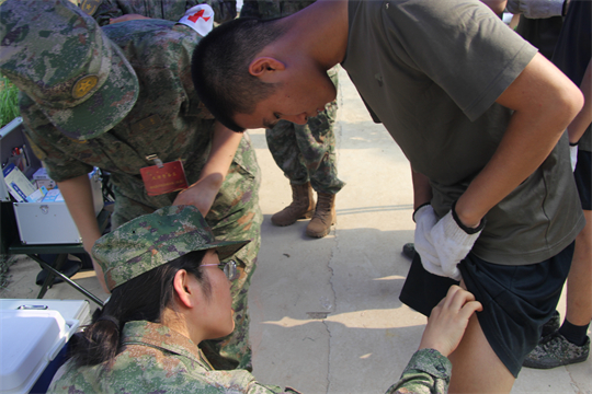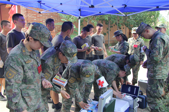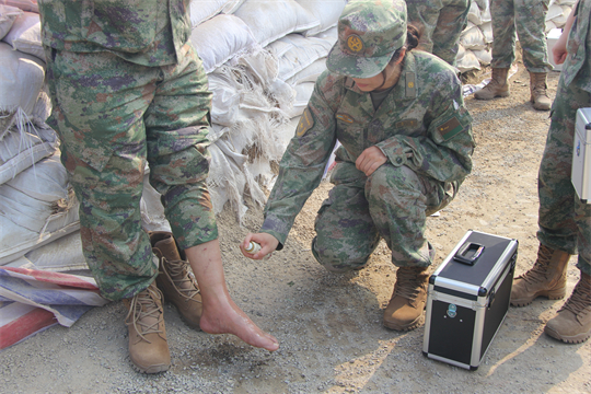 醫(yī)療隊抵達任務區(qū)域后,隊員們展開醫(yī)療救治工作。前線的戰(zhàn)士們由于蚊蟲叮咬和洪水長期浸泡,部分官兵出現感冒中暑、腹瀉濕疹、扭傷擦傷、皮膚潰爛等傷病情況。醫(yī)療隊迅即展開診療,對患病官兵開方拿藥,對尚未患病官兵講授預防,僅第一日便巡診180人次,處理傷口6人,開展健康防護科普宣教3場次。
