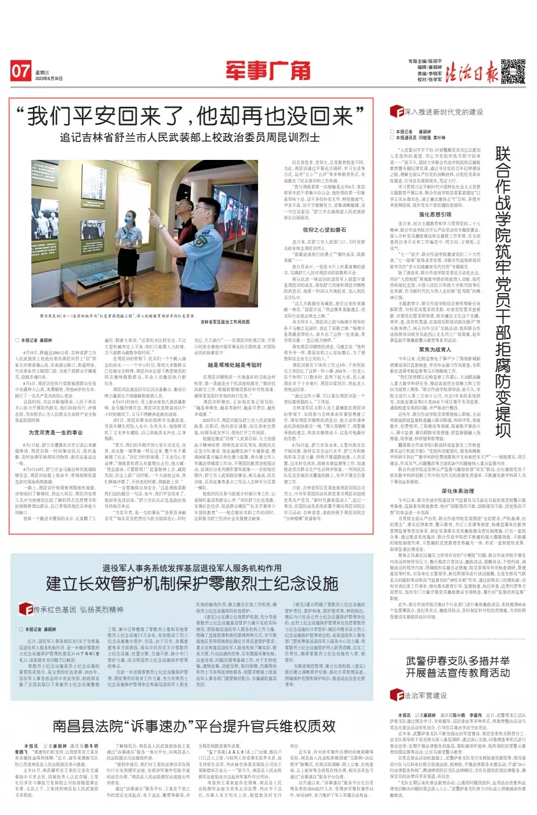 日前,吉林省軍區(qū)黨委批準(zhǔn)周昆訓(xùn)同志為烈士,中央軍委國(guó)防動(dòng)員部黨委為周昆訓(xùn)追授優(yōu)秀共產(chǎn)黨員、“新時(shí)代最美國(guó)動(dòng)人”,追記一等功,在國(guó)防動(dòng)員系統(tǒng)部署開(kāi)展向周昆訓(xùn)同志學(xué)習(xí)活動(dòng)。吉林省委、省政府授予周昆訓(xùn)同志“吉林楷?!睒s譽(yù)稱號(hào)。