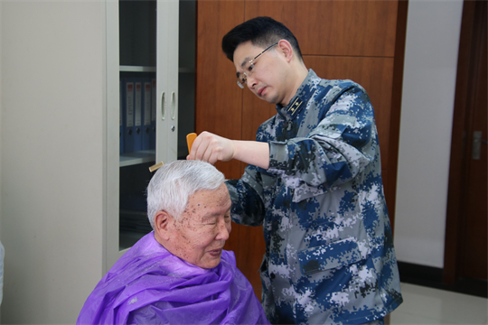 圖為周昆訓(xùn)(生前)服務(wù)保障為老干部剪頭。吉林省軍區(qū)政治工作局供圖