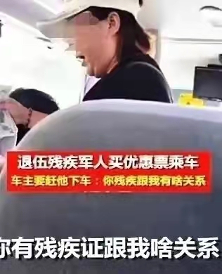 經(jīng)初步調(diào)查,9月1日上午,退伍殘疾軍人陳先生乘坐蒙F22637客運(yùn)班車,從內(nèi)蒙古自治區(qū)興安盟烏蘭浩特市去往吉林省白城市期間,該車乘務(wù)員何某某對(duì)陳先生所持的“中華人民共和國殘疾軍人證”不認(rèn)可,要求陳先生補(bǔ)票,并發(fā)表不正當(dāng)言論,造成惡劣影響。陳先生現(xiàn)場(chǎng)撥打12328熱線投訴,事后將現(xiàn)場(chǎng)視頻上傳某視頻平臺(tái)發(fā)布。