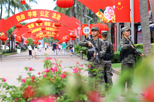 9月30日,國慶中秋“雙節(jié)”放假期間,擔(dān)負(fù)城市武裝巡邏任務(wù)的武警海南總隊??谥ш牴俦冀K堅守在執(zhí)勤一線,他們在商圈、公園、城市主干道等重點部位巡邏警戒,確保駐地安全穩(wěn)定。