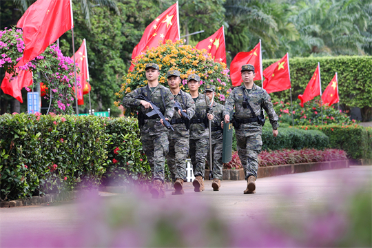 圖為擔(dān)負(fù)巡邏任務(wù)的武警海南總隊官兵在??诮鹋X公園巡邏執(zhí)勤。