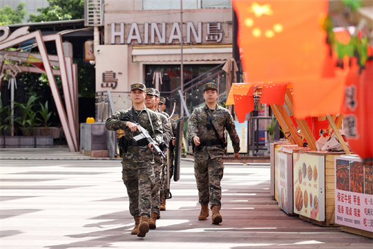 圖為擔(dān)負(fù)巡邏任務(wù)的武警海南總隊官兵在??谏习畎賲R城巡邏執(zhí)勤。