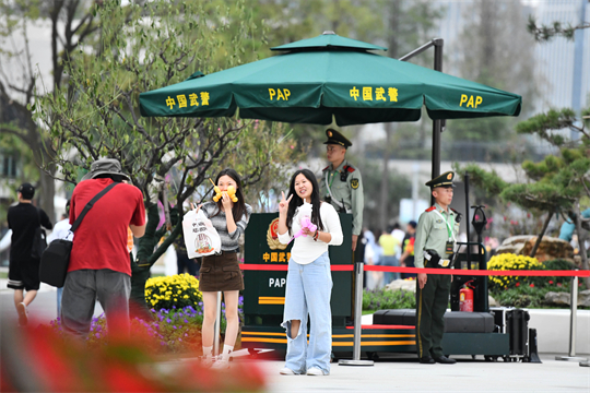 圖為9月26日,在第十四屆中國(guó)(合肥)國(guó)際園林博覽會(huì)現(xiàn)場(chǎng),武警執(zhí)勤官兵為游客提供便民服務(wù)。