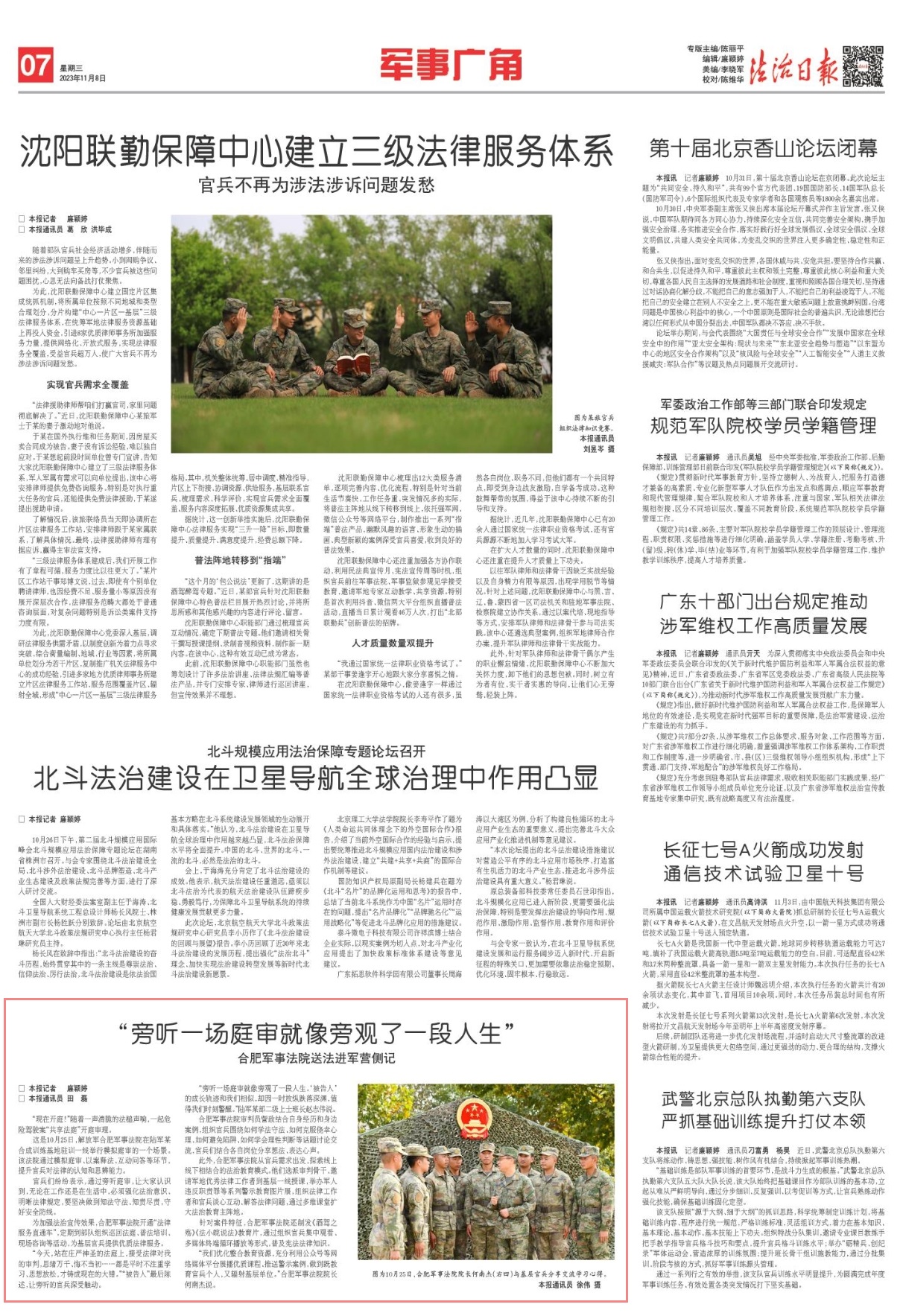 這是10月25日,解放軍合肥軍事法院在陸軍某合成訓(xùn)練基地駐訓(xùn)一線舉行模擬庭審的一個(gè)場(chǎng)景。該法院通過模擬庭審、以案釋法、互動(dòng)問答等環(huán)節(jié),提升官兵對(duì)法律的認(rèn)知和思辨能力。