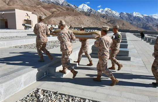 近日,新疆維吾爾自治區(qū)軍地檢察機關(guān)和退役軍人事務(wù)部門相關(guān)人員來到康西瓦烈士陵園,共同迎接“失散”多年的英烈遺骸“歸隊”,8名邊防官兵邁著穩(wěn)重的步伐,輕輕將遺骸放入墓穴中。