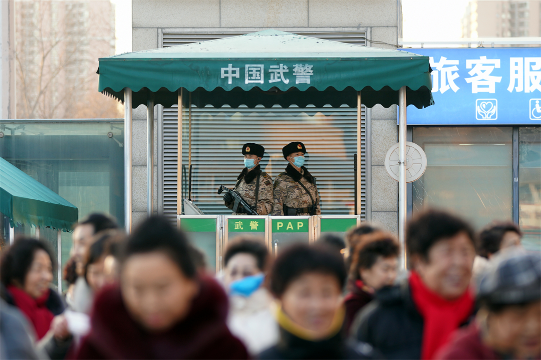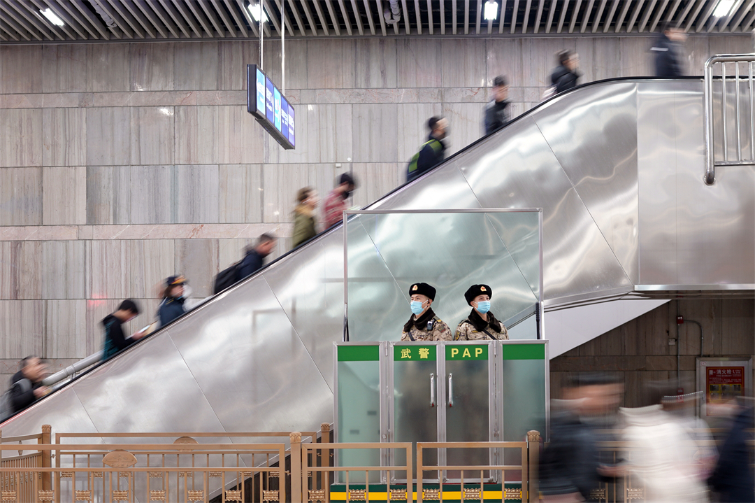 圖為北京西站南廣場武警正在認真履職。