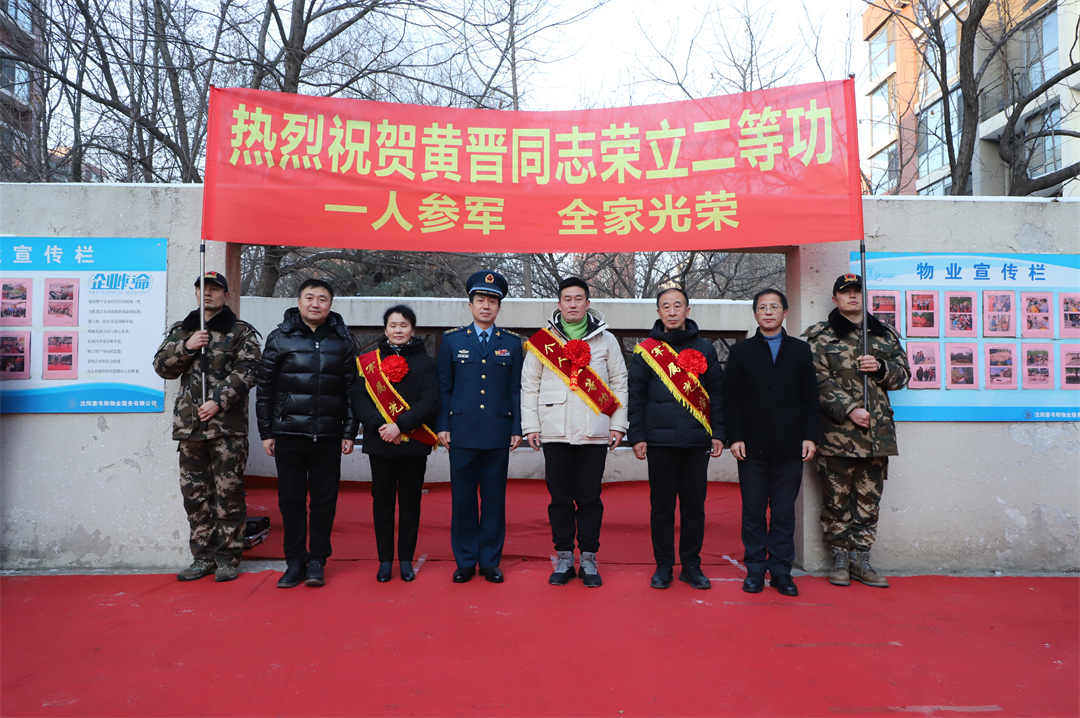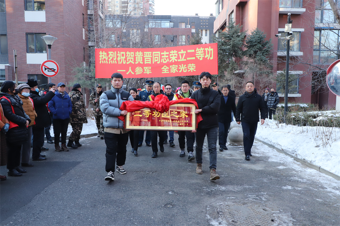 1月4日,遼寧省沈陽市大東區(qū)東方歐博城小區(qū)內(nèi)鑼鼓喧天、人頭攢動(dòng)。沈陽市大東區(qū)退役軍人事務(wù)局聯(lián)合大東區(qū)人武部和中國人民解放軍某部一起,為榮立二等功的黃晉送來立功喜報(bào)和“二等功臣之家”牌匾。