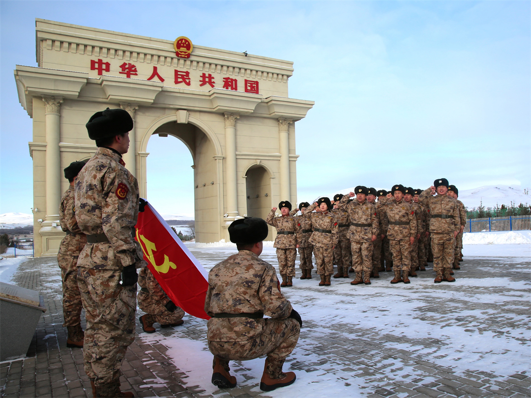 在祖國北疆的國門前,全體人員面向黨旗莊嚴(yán)宣誓。大家緊握的拳頭堅(jiān)定有力,鏗鏘的誓言響徹云霄,表達(dá)著對(duì)黨忠誠的堅(jiān)定信仰和為國防事業(yè)不懈奮斗的決心。