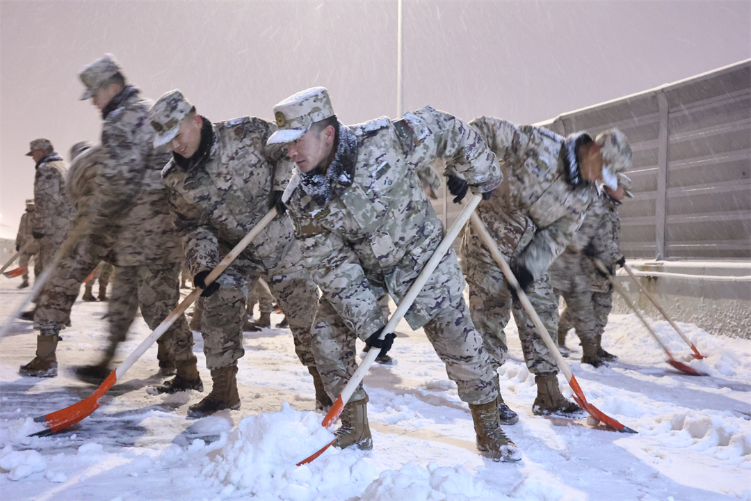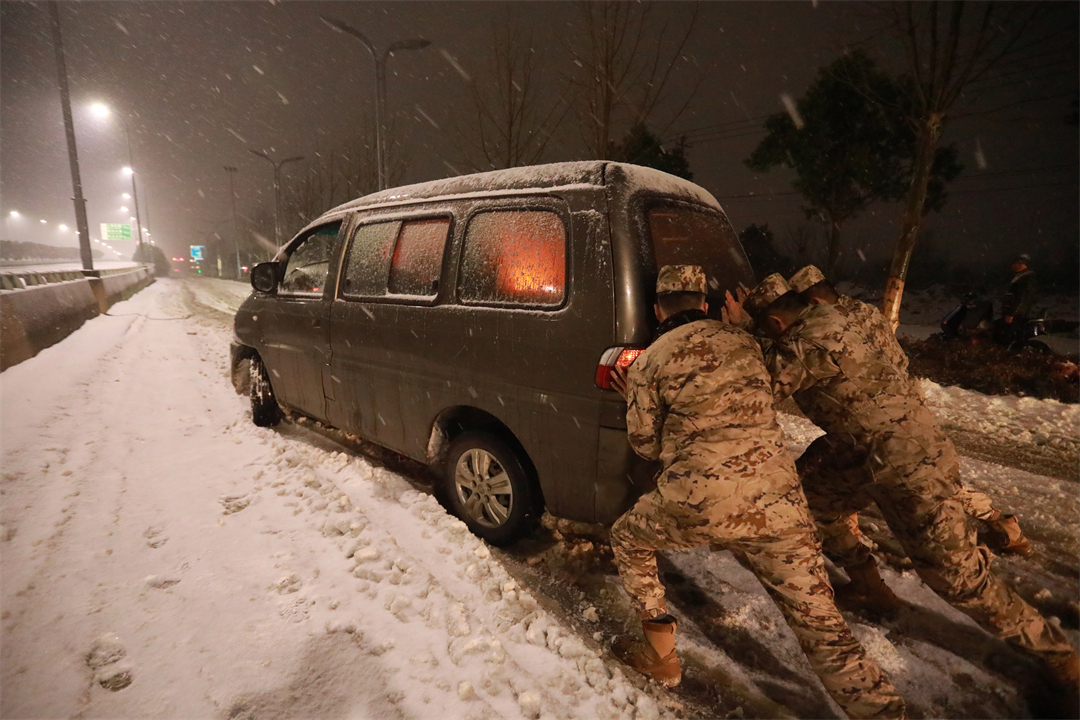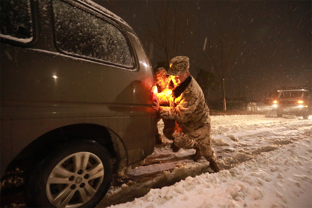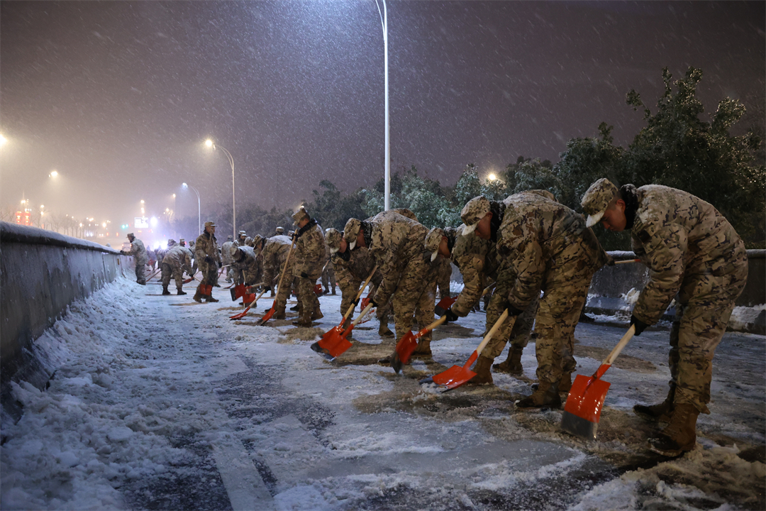 4日凌晨,武警湖北總隊訓(xùn)練基地接到駐地政府救援請求,駐地金山大道、臨空港大道等周邊多條高架和快速路匝道結(jié)冰,進(jìn)出車輛通行受到嚴(yán)重影響,已發(fā)生多起車禍。2時30分許,他們緊急出動投入到破冰搶險工作中,至4日8時,累計清理結(jié)冰道路2公里,清掃積雪15000多平方米,得到地方政府和人民群眾的高度贊譽(yù)。