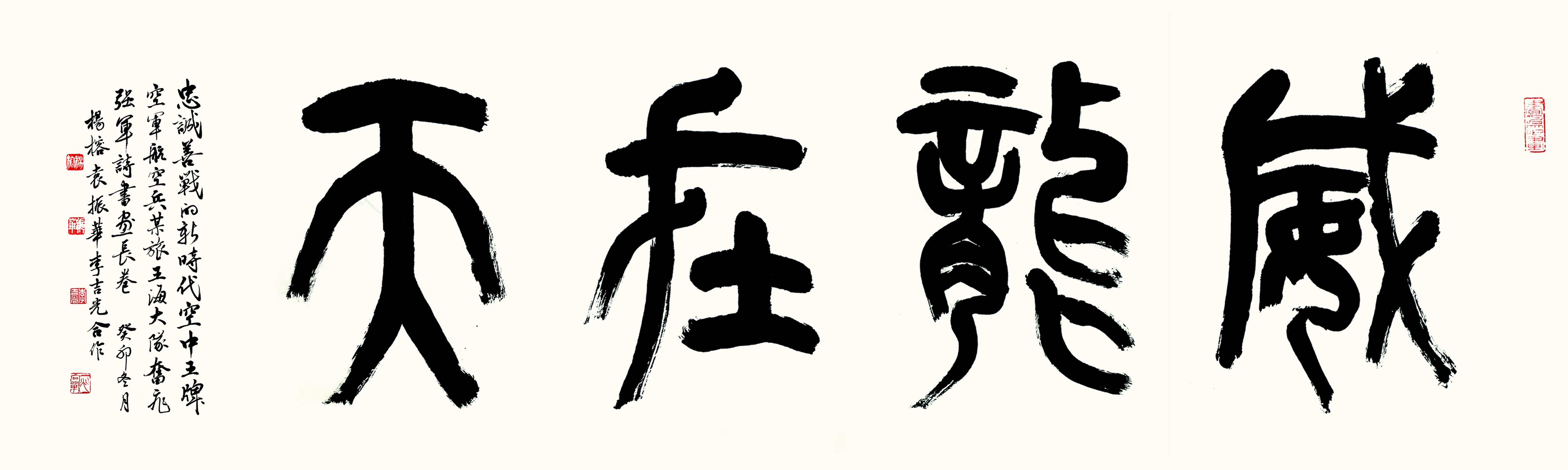 《威龍?jiān)谔臁吩?shī)書(shū)畫(huà)長(zhǎng)卷,以中國(guó)傳統(tǒng)文化中的詩(shī)詞、書(shū)法和繪畫(huà)的藝術(shù)形式,通過(guò)傳統(tǒng)筆墨全景式展現(xiàn)70多年來(lái)“王海大隊(duì)”的“聞戰(zhàn)則喜,英勇頑強(qiáng),敢打必勝,有我無(wú)敵”的精神傳承和價(jià)值追求。英雄傳人亦英雄,新時(shí)代“王海大隊(duì)”昂首闊步,敢闖新路,當(dāng)先鋒打頭陣,奮力譜寫(xiě)強(qiáng)軍興軍新征程的時(shí)代篇章,奮飛一流、制勝空天的鮮活畫(huà)卷。