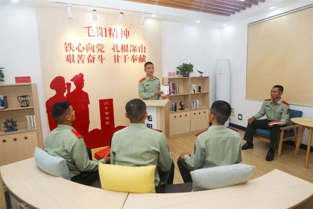 執(zhí)勤六中隊(duì)現(xiàn)任指導(dǎo)員金生清楚記得,去年3月到中隊(duì)任職時(shí)參加黨支部會(huì)議的場(chǎng)景。當(dāng)時(shí),支部成員沒進(jìn)會(huì)議室,而是來到五指山革命根據(jù)地紀(jì)念園。“任職干部只有領(lǐng)會(huì)艱苦奮斗、自立自強(qiáng)、不屈不撓的瓊崖精神內(nèi)涵,才能在工作中捋清思路、抓準(zhǔn)重點(diǎn)……”時(shí)任指導(dǎo)員楊興科說。他們開展“踏訪紅色足跡、砥礪初心使命”教育活動(dòng),激發(fā)官兵建功軍營的使命感;邀請(qǐng)瓊崖老紅軍講述革命故事,引導(dǎo)官兵將瓊崖精神內(nèi)化于心,外化于行;培養(yǎng)紅色講解員,向更多人宣講瓊崖精神的時(shí)代內(nèi)涵。