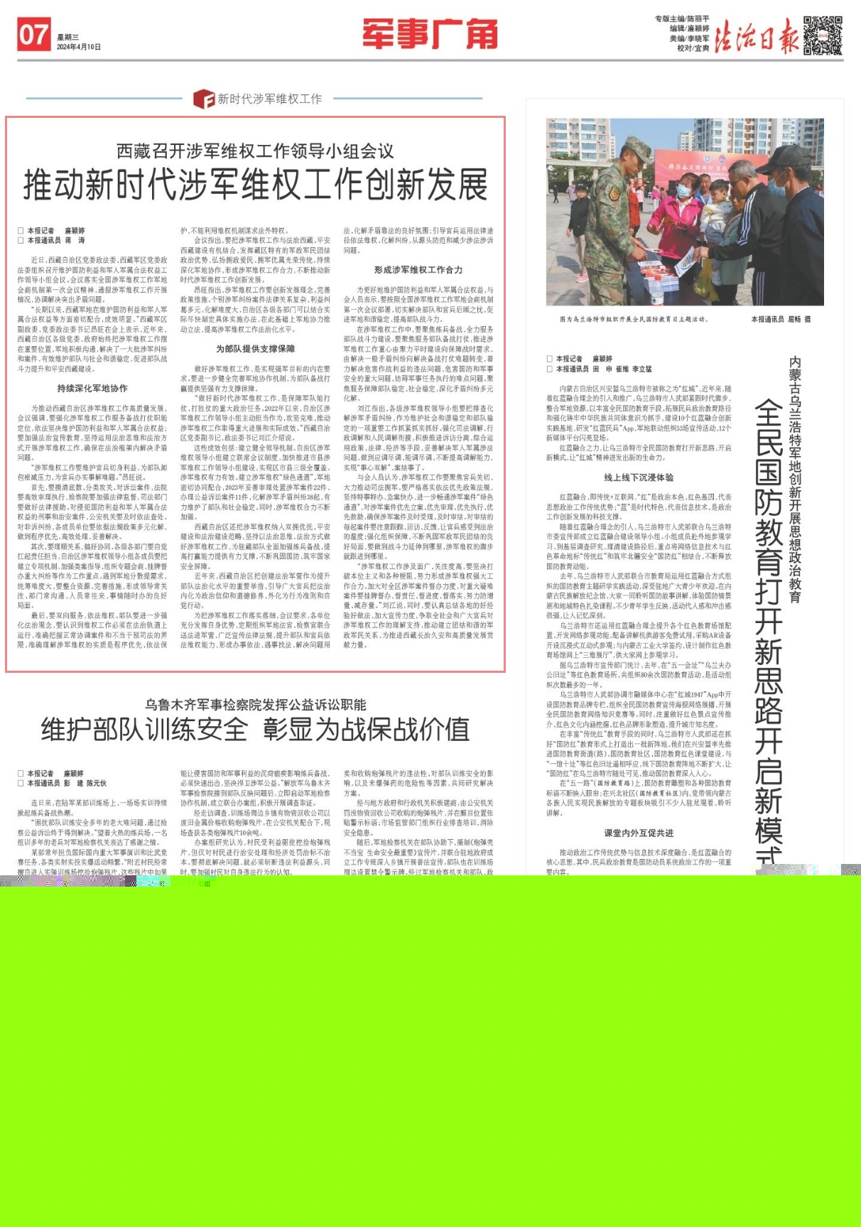 西藏自治區(qū)還把涉軍維權(quán)納入雙擁優(yōu)撫、平安建設(shè)和法治建設(shè)范疇,堅(jiān)持以法治思維、法治方式做好涉軍維權(quán)工作,為駐藏部隊(duì)全面加強(qiáng)練兵備戰(zhàn)、提高打贏(yíng)能力提供有力支撐,不斷鞏固國(guó)防、筑牢國(guó)家安全屏障。