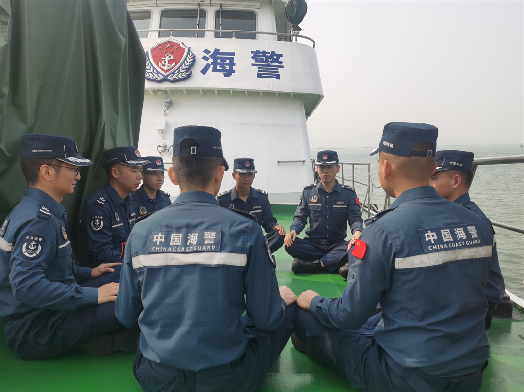 圖為執(zhí)法員正在甲板上進(jìn)行國家安全主題討論交流。