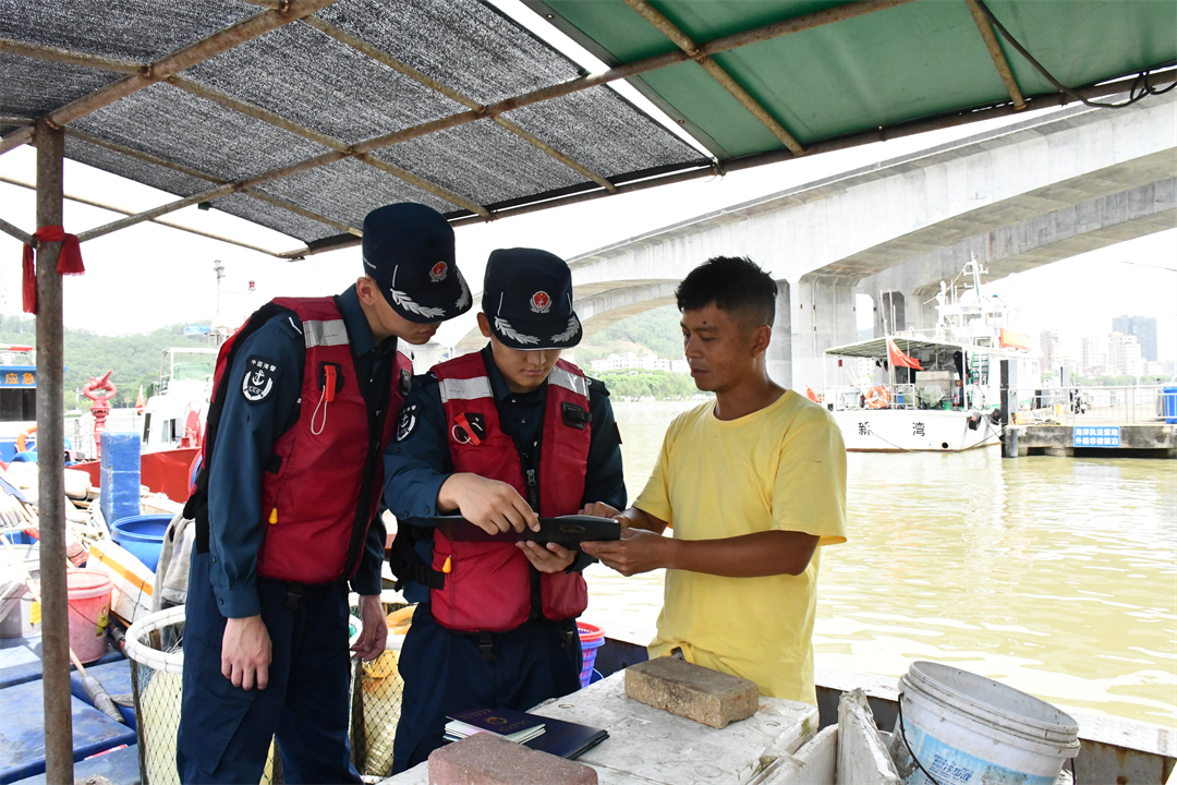 圖為海警執(zhí)法員登船普及防臺防汛知識。
