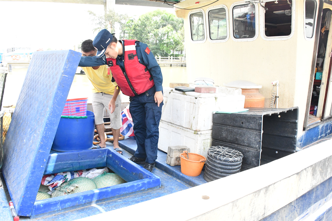 圖為海警執(zhí)法員對轄區(qū)沿海碼頭設施、建筑物和船只進行地毯式排查。