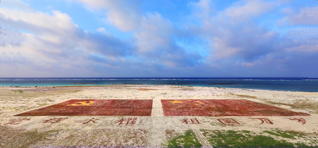 圖為“黨徽永耀 祖國萬歲”西沙中建島官兵種植海馬草,鋪成黨旗、國旗的形狀。