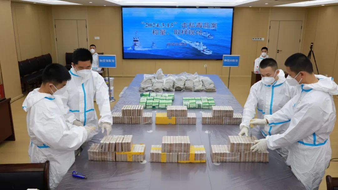 圖為今年3月,福建海警局破獲“2024.3.15”特大走私毒品案,海警執(zhí)法員對(duì)涉案毒品稱量、取樣。