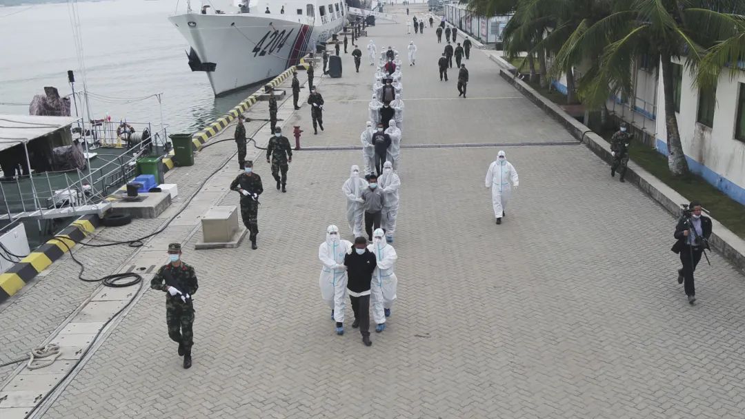 圖為2023年2月4日,中國(guó)海警局直屬第三局執(zhí)法員押解“2022-363”海上特大毒品案涉案人員。