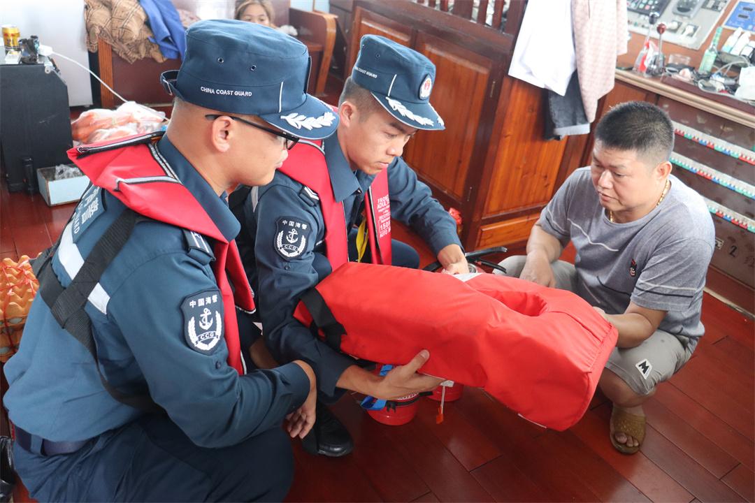 圖為8月15日,廣西北海海警局在轄區(qū)海域幫助漁民檢查漁船設(shè)施,為開漁做好準備。