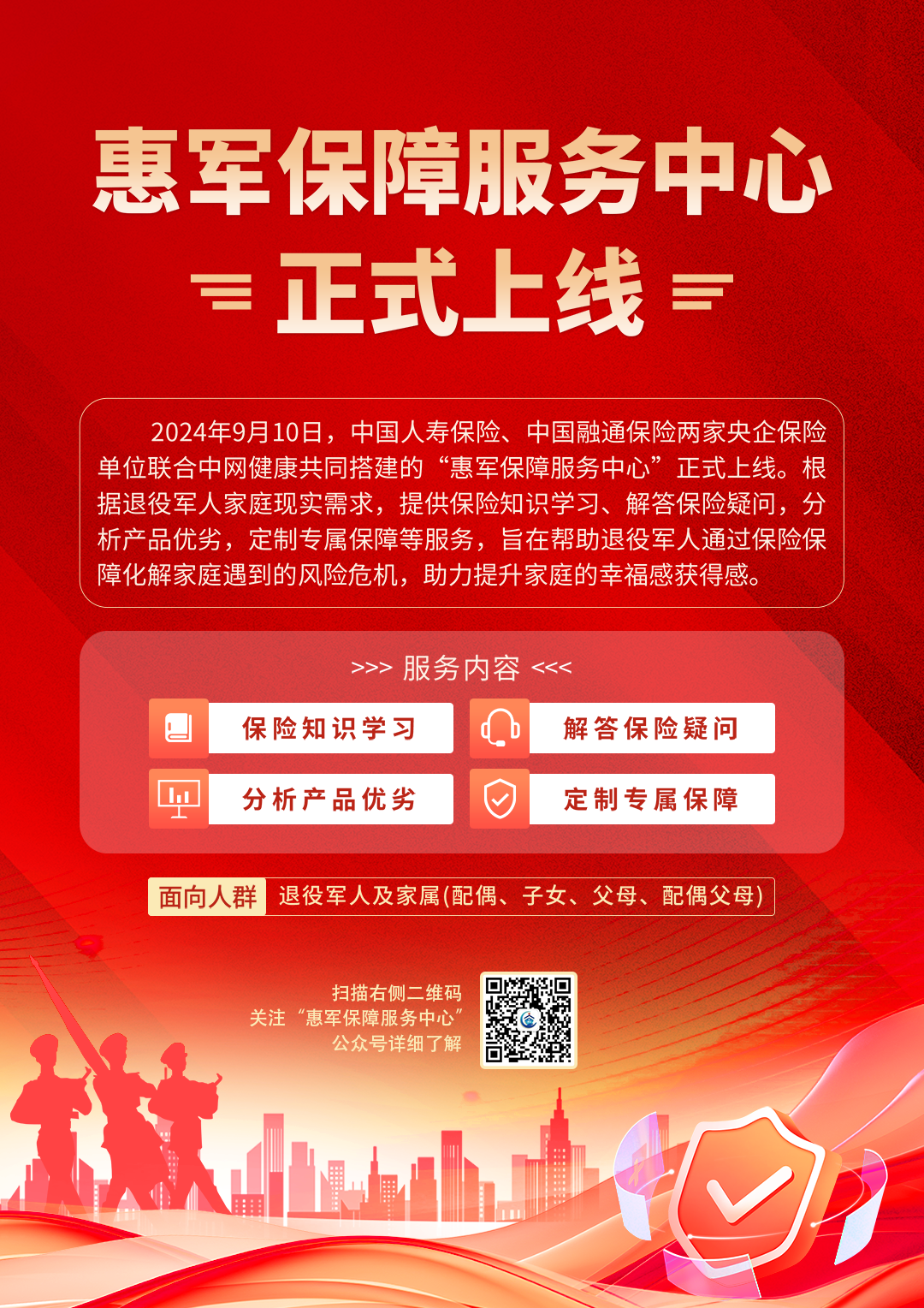 可關(guān)注“惠軍保障服務(wù)中心”公眾號,了解、咨詢退役軍人專屬保險(xiǎn)服務(wù)內(nèi)容。通過增強(qiáng)保險(xiǎn)知識,選擇適合保障,防患未然、抵御風(fēng)險(xiǎn),為自己的美好幸福生活筑堤護(hù)坡、保駕護(hù)航!