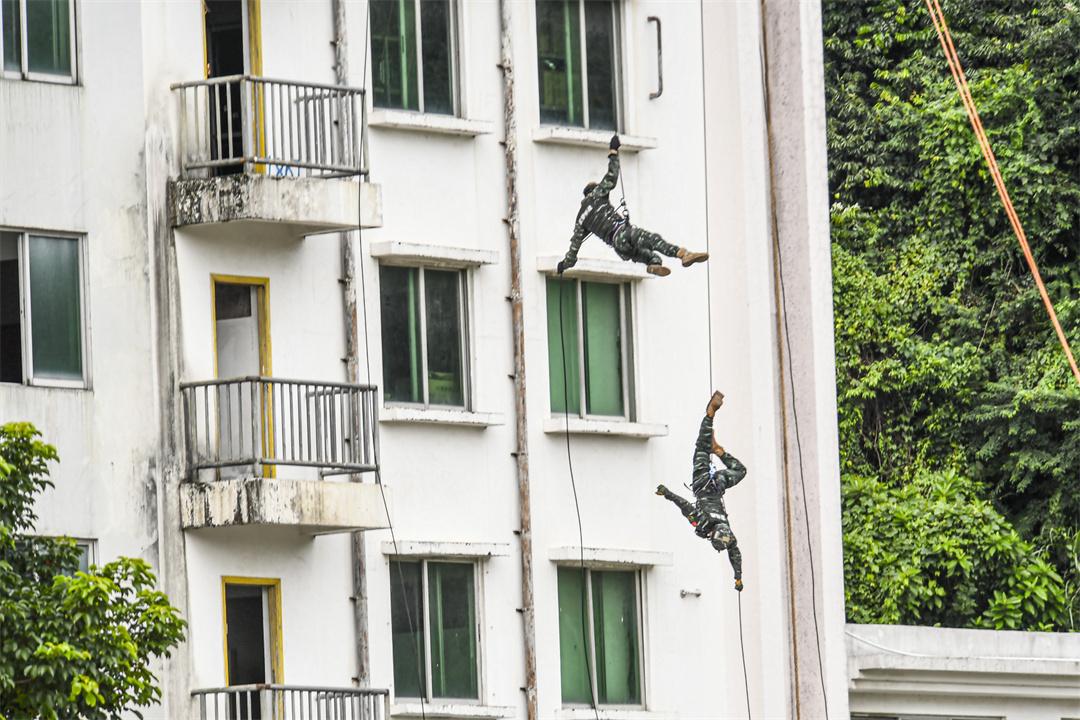 圖為官兵進行攀登課目演示。