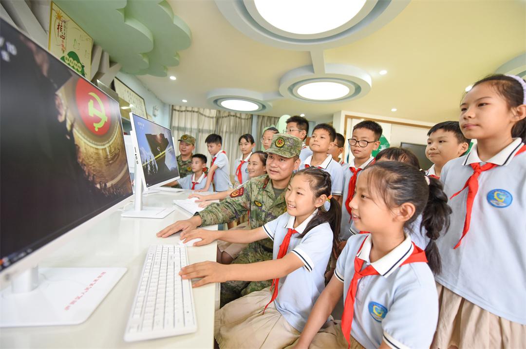 圖為合肥市廬陽區(qū)民兵與學(xué)生一起觀看紅色紀(jì)錄片《薪火傳承》。