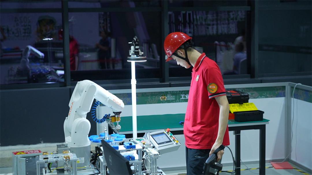 圖為工業(yè)機器人系統(tǒng)操作員比賽進行中。