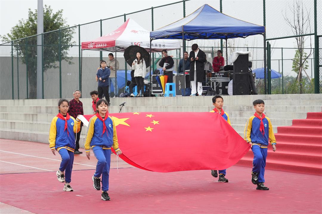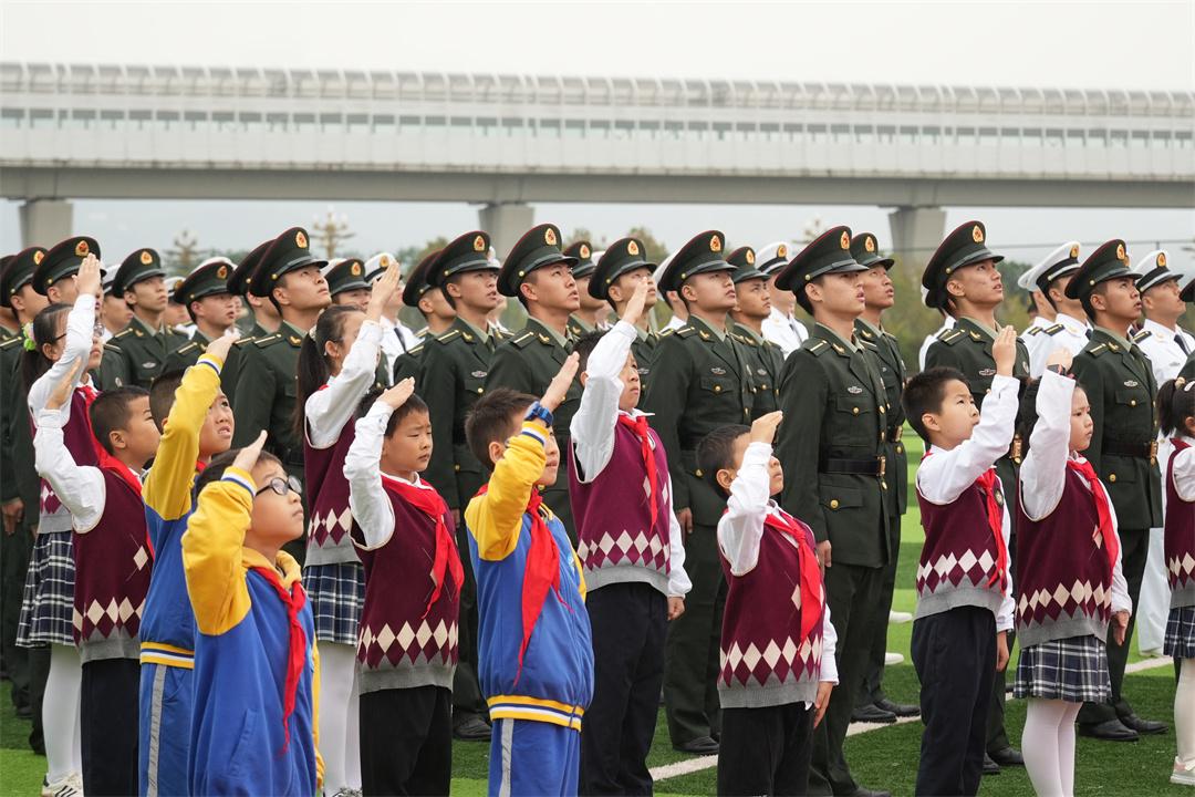 升旗儀式開始前,五星紅旗由少先隊(duì)員代表組成的“紅領(lǐng)巾護(hù)旗手”方隊(duì)傳遞至由航天科技集團(tuán)七院重慶航天職業(yè)技術(shù)學(xué)院共青團(tuán)員軍士生組成的國旗護(hù)衛(wèi)隊(duì)。伴隨著雄壯激昂的國歌,鮮艷的五星紅旗冉冉升起。