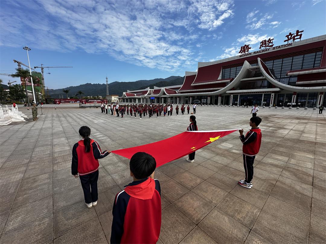 11月12日,“紅領(lǐng)巾愛祖國——我心中的五星紅旗”國旗傳遞活動,在中老鐵路磨憨站舉行。