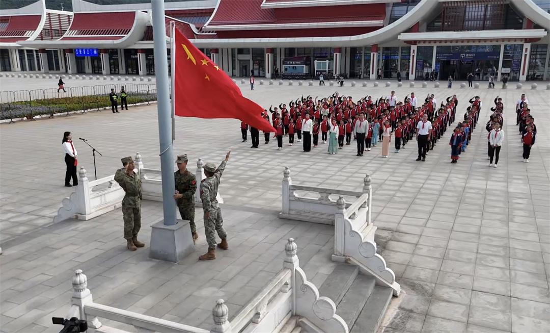 活動現(xiàn)場,由少先隊員代表組成的“紅領(lǐng)巾護旗手”方隊手持國旗入場,將國旗傳遞至磨憨國旗護衛(wèi)隊,護衛(wèi)隊邁著鏗鏘有力的步伐走向升旗臺。伴隨著莊嚴(yán)的國歌聲,這面意義非凡的國旗在磨憨鐵路邊檢站冉冉升起。