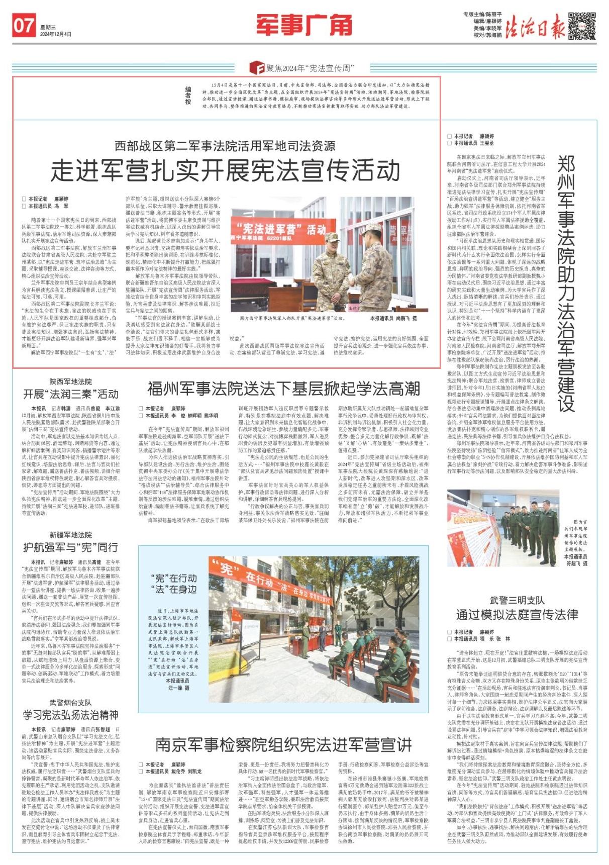 12月4日是第十一個國家憲法日,日前,中央宣傳部、司法部、全國普法辦聯(lián)合印發(fā)通知,以“大力弘揚(yáng)憲法精神,推動進(jìn)一步全面深化改革”為主題,在全國組織開展2024年“憲法宣傳周”活動?;顒悠陂g,軍地法院、檢察院聯(lián)合部隊(duì),通過宣講授課、贈送法律書籍、模擬庭審、現(xiàn)場提供法律咨詢等多種形式開展送法進(jìn)軍營活動,形成上下聯(lián)動、共同參與、整體推進(jìn)的憲法宣傳教育格局,不斷推動憲法宣傳教育取得實(shí)效,助力部隊(duì)法治軍營建設(shè)。